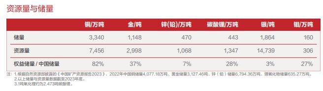 从保有证实储量和可信储量来看,紫金矿业拥有铜3339.81万吨,占资源总量的45%;金1148.49吨,占资源总量的38%;锌(铅)469.92万吨,占资源总量的44%;银1863.89吨,占资源总量的13%;锂储量(当量碳酸锂)442.65万吨,占资源总量的33%。