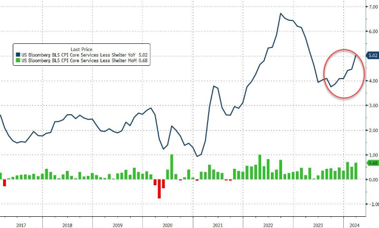 在核心指数中,商品成本同比继续下降,但服务业正在重新加速。所谓的超级核心通胀,核心CPI服务指数环比飙升0.7%,同比飙升5.0%,这是2023年4月以来最高。超级核心通胀的每个组成部分环比和同比均上涨。