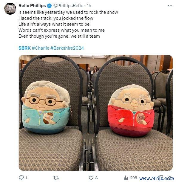 有网友摆出现场售卖的巴菲特与芒格玩偶,就好像他们曾经携手并肩坐在股东大会主席台上一样,并引用美国说唱歌手吹牛老爹(Puff Daddy)在《我会想念你》(I‘ll be missing you )一曲中的歌词: